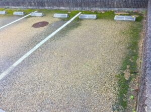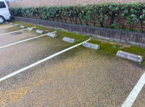 一方、こちらの駐車場では、長期間にわたり苔が広範囲に繁殖しており、表面に分厚く堆積している状態でした。