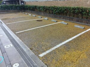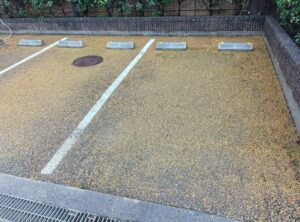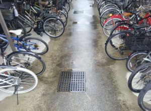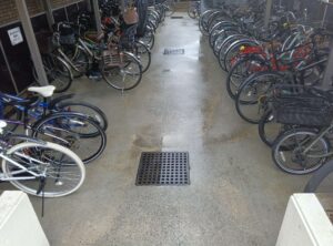 駐輪場の床面は、日常的な使用により砂埃や黒ずみ汚れが蓄積しやすい箇所です。