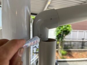 新品の縦樋パイプを設置後、接続面を接着剤で固定して修繕しております。